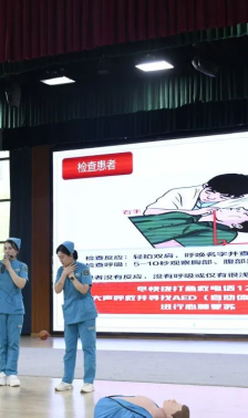 本次讲座中,李艳老师为同学们详细讲解了心肺复苏急救技术,并现场进行示范演练,以仿真人为器具,现场演示了正确的心肺按压和人工呼吸。通过观看并实操,同学们不仅深入直观地了解了高质量心肺复苏的要点,还学会了一些施救的技能和如何为救护创造最佳条件,切实保护生命健康安全。
