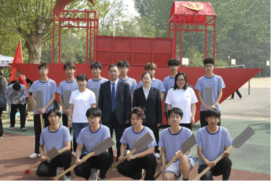 紧随其后是手持船桨的同学们,身着蓝白条纹衫整齐列队。在跑道上,他们动作整齐划一,挥舞船桨,仿佛正齐心协力划动红船,于时代浪潮中勇毅前行。那坚定的神情、有力的动作,是对革命先辈奋斗精神的致敬与传承,更是在向全体师生展现英国上市公司365学子传承红色基因、勇担时代使命的决心。
