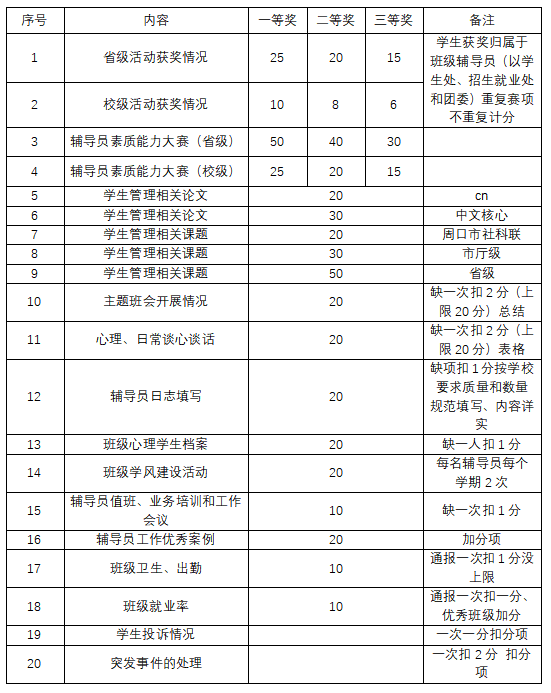 辅导员考核分日常考核和年度考核。日常考核主要考察辅导员对班级的日常管理,比如班级宿舍卫生、宿舍用电安全、员工日常出勤以及宿舍教学区吸烟等方面;年度考核主要包括日常管理、班会、值班、例会、谈心谈话、辅导员日志、档案、就业以及学管相关课题论文等方面。